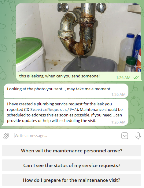 In the previous post, I talked about the PropertySphere Telegram bot (you can also watch the full video here). In this post, I want to show how we can make it even smarter. Take a look at the following chat screenshot: